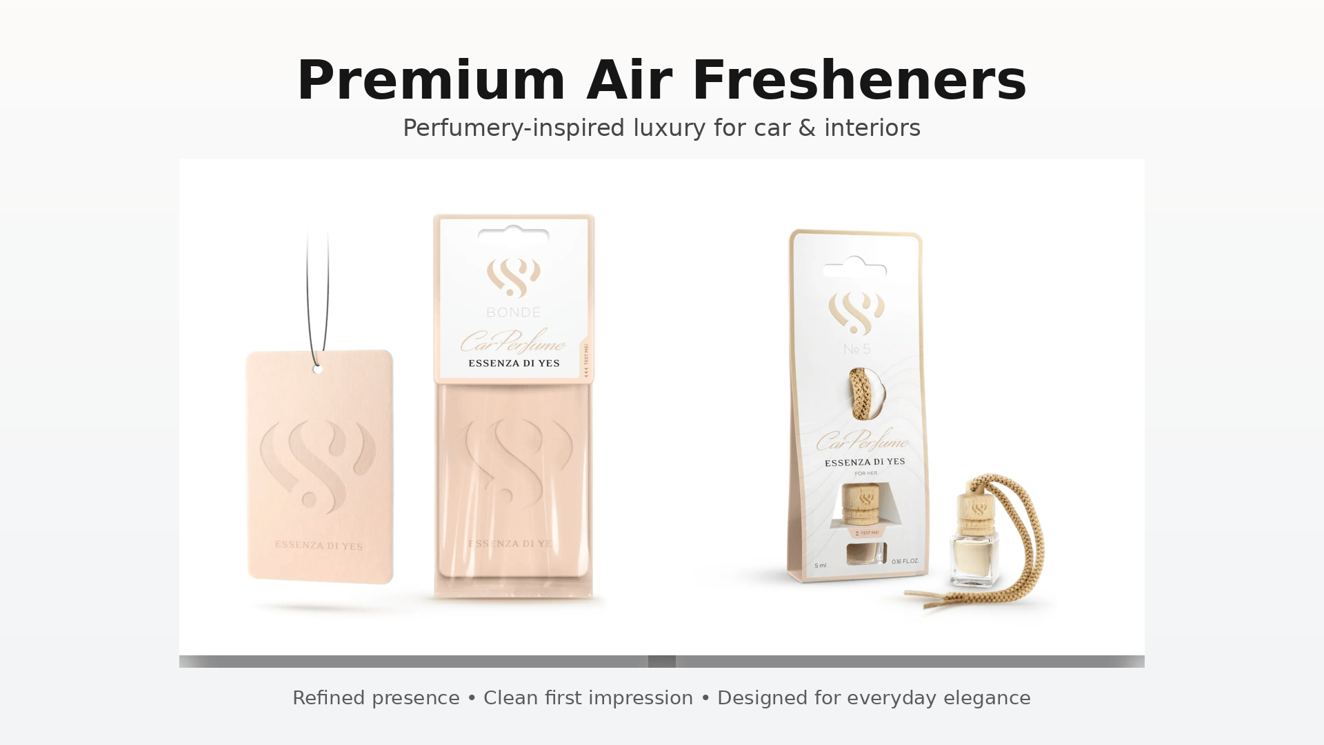 BONDE es una lujosa colección de perfumería diseñada para elevar los interiores de los coches y los espacios pequeños con una primera impresión limpia y segura, y después una estela suave y duradera que se siente refinada, no estridente. Los perfiles son equilibrados y modernos: frescos donde deben ser frescos, cálidos donde deben ser cálidos y siempre controlados, para que el aroma indique calidad, no “encubrimiento”.