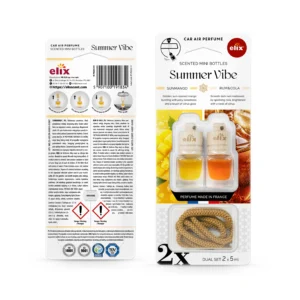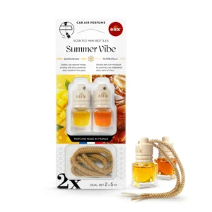 Bring holiday mood to every drive. The Summer Vibe car air freshener pairs two mini bottles: Sunmango for juicy, sun-ripe mango brightness, and Rum & Cola for a fizzy, spiced twist with an easygoing evening vibe. Swap scents to match your moment or share one with a partner. Each glass mini uses a natural wooden diffuser cap for smooth, even release—no sprays, heat or batteries.