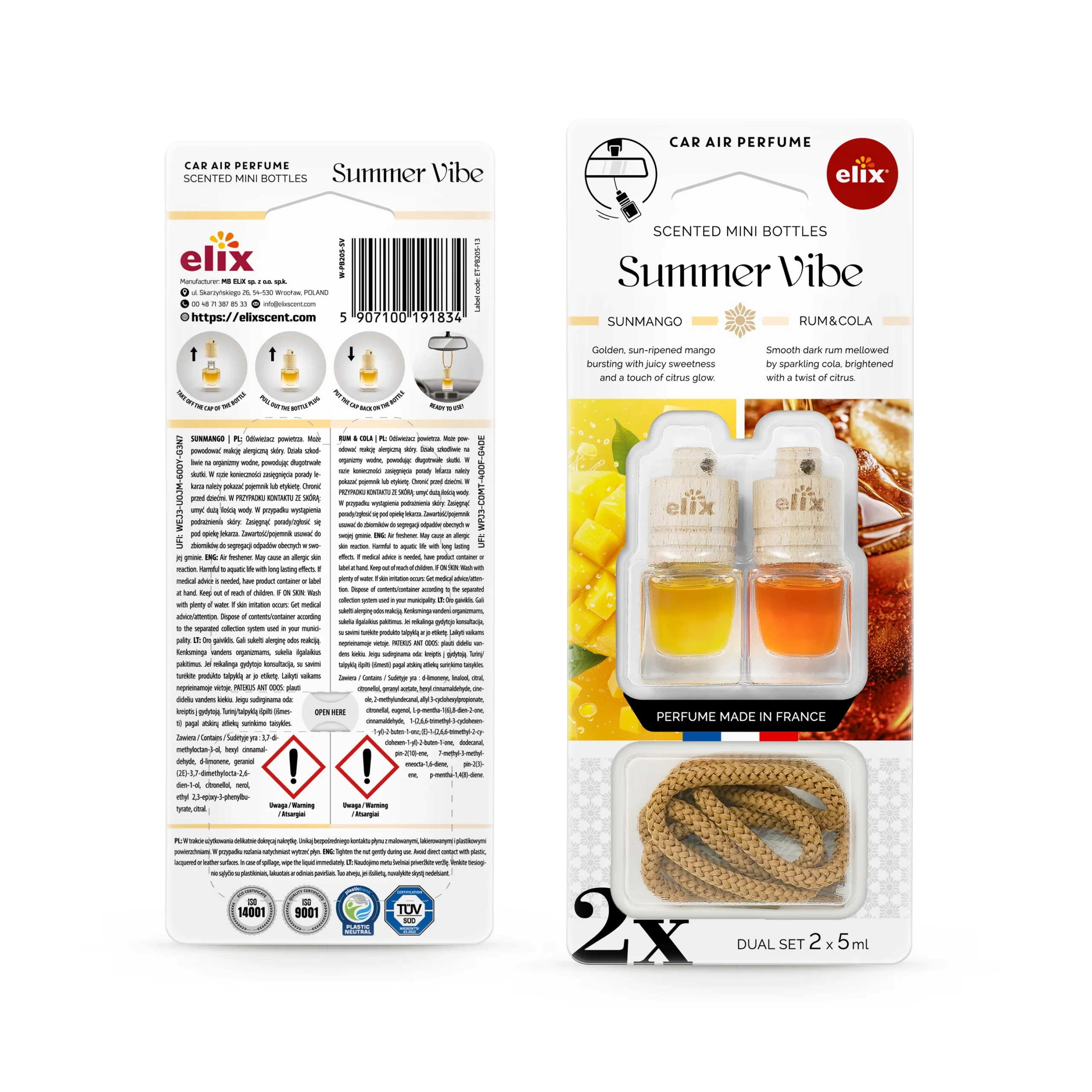 Bring holiday mood to every drive. The Summer Vibe car air freshener pairs two mini bottles: Sunmango for juicy, sun-ripe mango brightness, and Rum & Cola for a fizzy, spiced twist with an easygoing evening vibe. Swap scents to match your moment or share one with a partner. Each glass mini uses a natural wooden diffuser cap for smooth, even release—no sprays, heat or batteries.