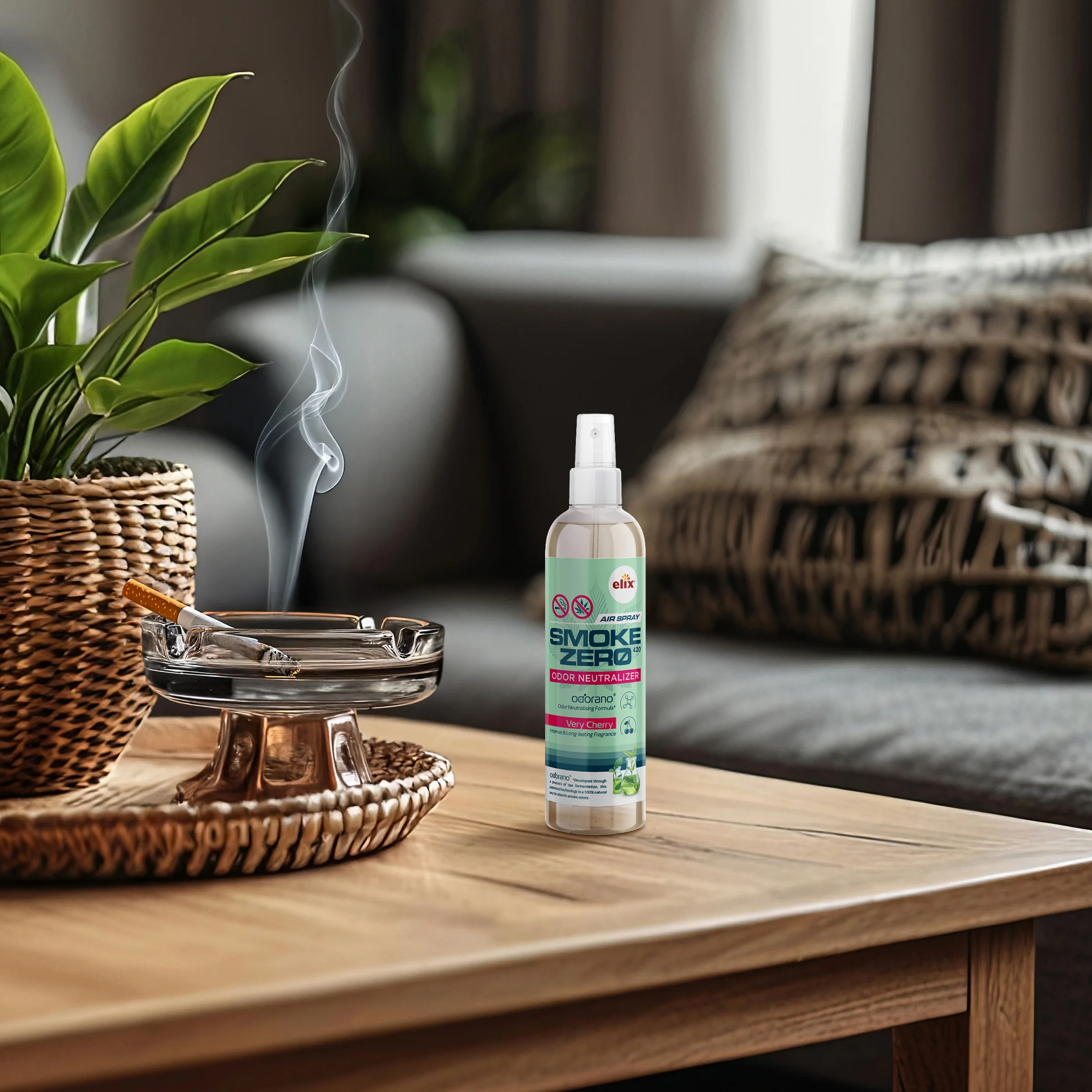 SMOKE ZERO 420 — Complete Smoke Odor Neutralizer System SMOKE ZERO 420 is a complete, multi-format system designed to permanently neutralize cigarette and cannabis smoke odors — not mask them. At its core is odorano®, a patented Odor Neutralising Formula developed through tea fermentation technology: a 100% natural process that molecularly absorbs and destroys smoke odor compounds at the source. Unlike single-product solutions, SMOKE ZERO 420 works on every level simultaneously — treating the air, fabrics, and surfaces where smoke odors accumulate. Each format in the system is formulated with odorano® and enhanced with an intense, long-lasting Very Cherry fragrance. Manufactured in Wrocław, Poland, under ISO 9001 and BRC Global Standards certification.