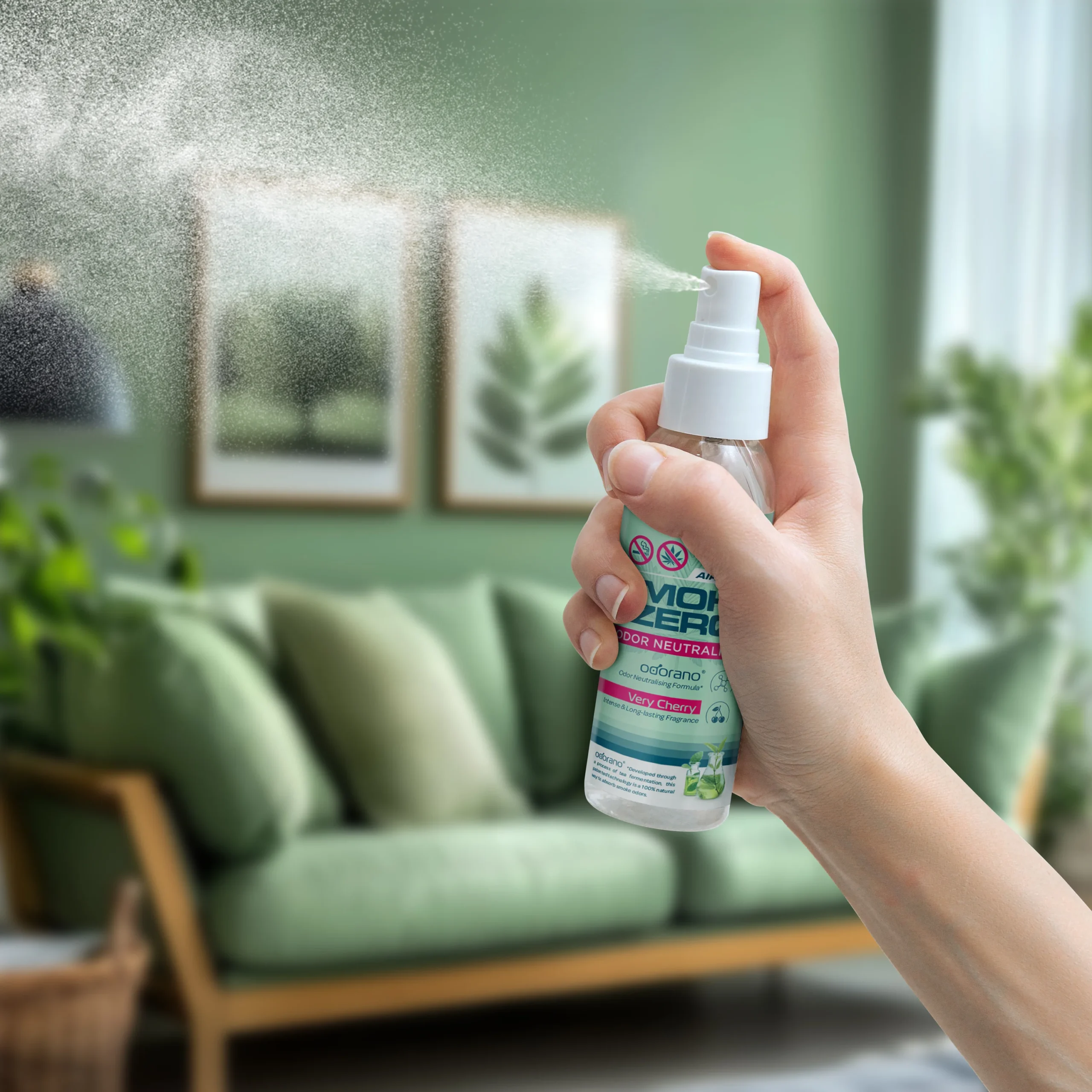 Unlike conventional room sprays that layer fragrance on top of smoke, this formula is built around odorano® — a patented Odor Neutralising Formula developed through natural tea fermentation. When sprayed into the air, odorano® binds directly to airborne smoke VOC molecules and permanently deactivates them. What follows is not a covered smell — it's a genuinely clean space, finished with an intense, long-lasting Very Cherry fragrance.