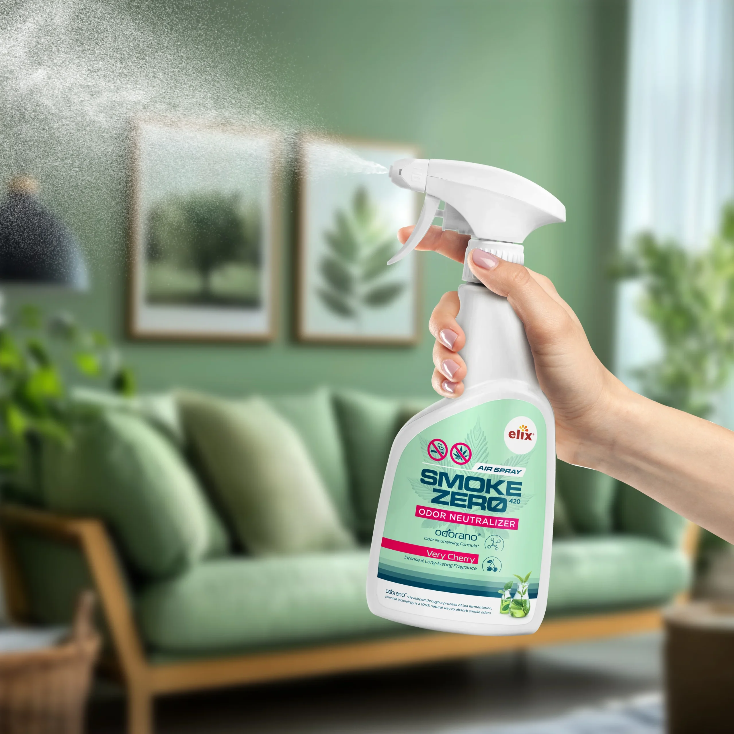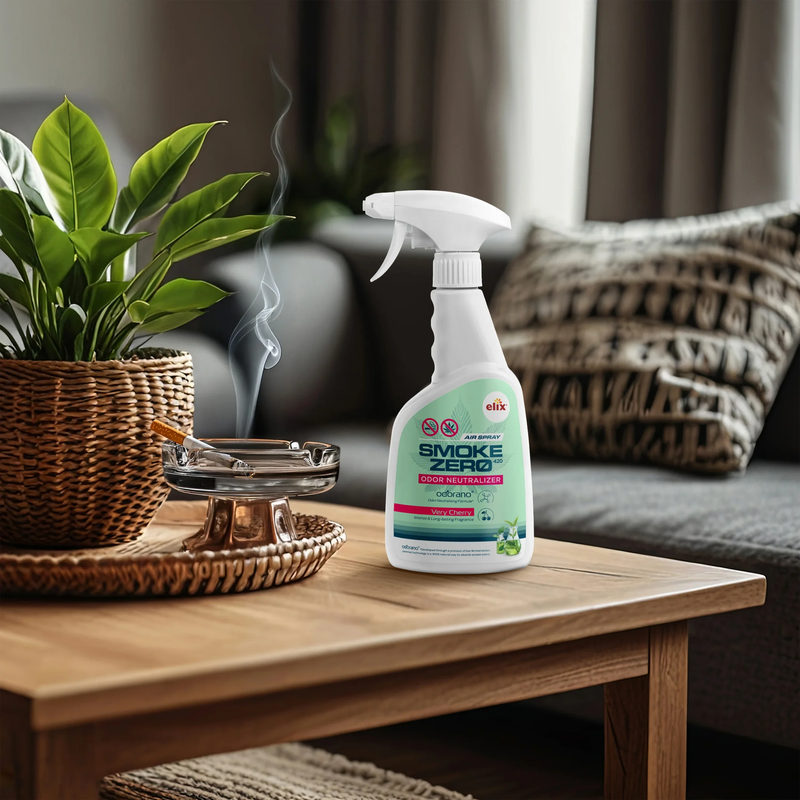 SMOKE ZERO 420 — Complete Smoke Odor Neutralizer System SMOKE ZERO 420 is a complete, multi-format system designed to permanently neutralize cigarette and cannabis smoke odors — not mask them. At its core is odorano®, a patented Odor Neutralising Formula developed through tea fermentation technology: a 100% natural process that molecularly absorbs and destroys smoke odor compounds at the source. Unlike single-product solutions, SMOKE ZERO 420 works on every level simultaneously — treating the air, fabrics, and surfaces where smoke odors accumulate. Each format in the system is formulated with odorano® and enhanced with an intense, long-lasting Very Cherry fragrance. Manufactured in Wrocław, Poland, under ISO 9001 and BRC Global Standards certification.