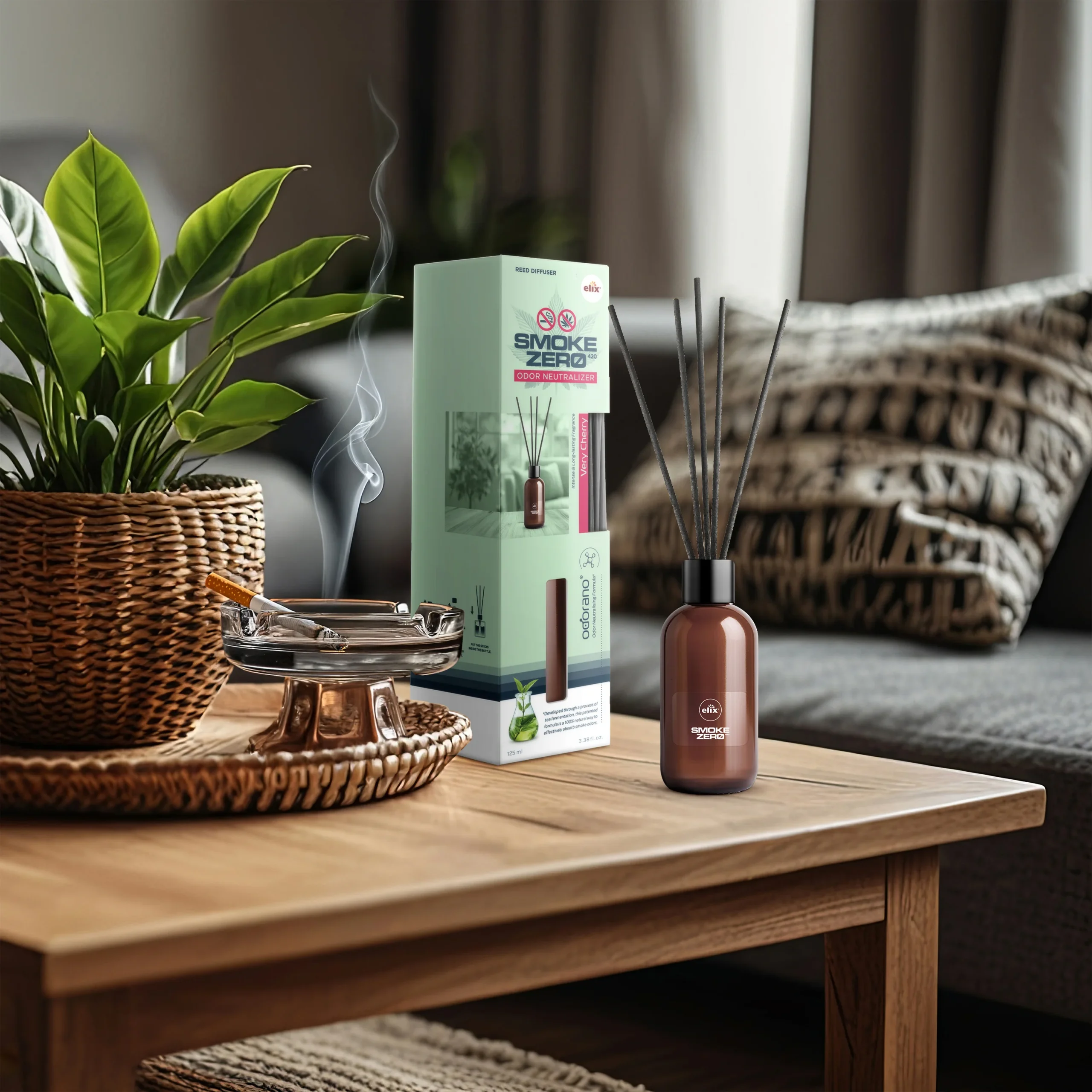 The diffuser comes ready to use: amber-toned PET bottle, dark reeds, premium retail carton with setup instructions in three steps. Fragrance: Very Cherry — intense and long-lasting, building a consistent scent layer that replaces smoke with something genuinely pleasant.