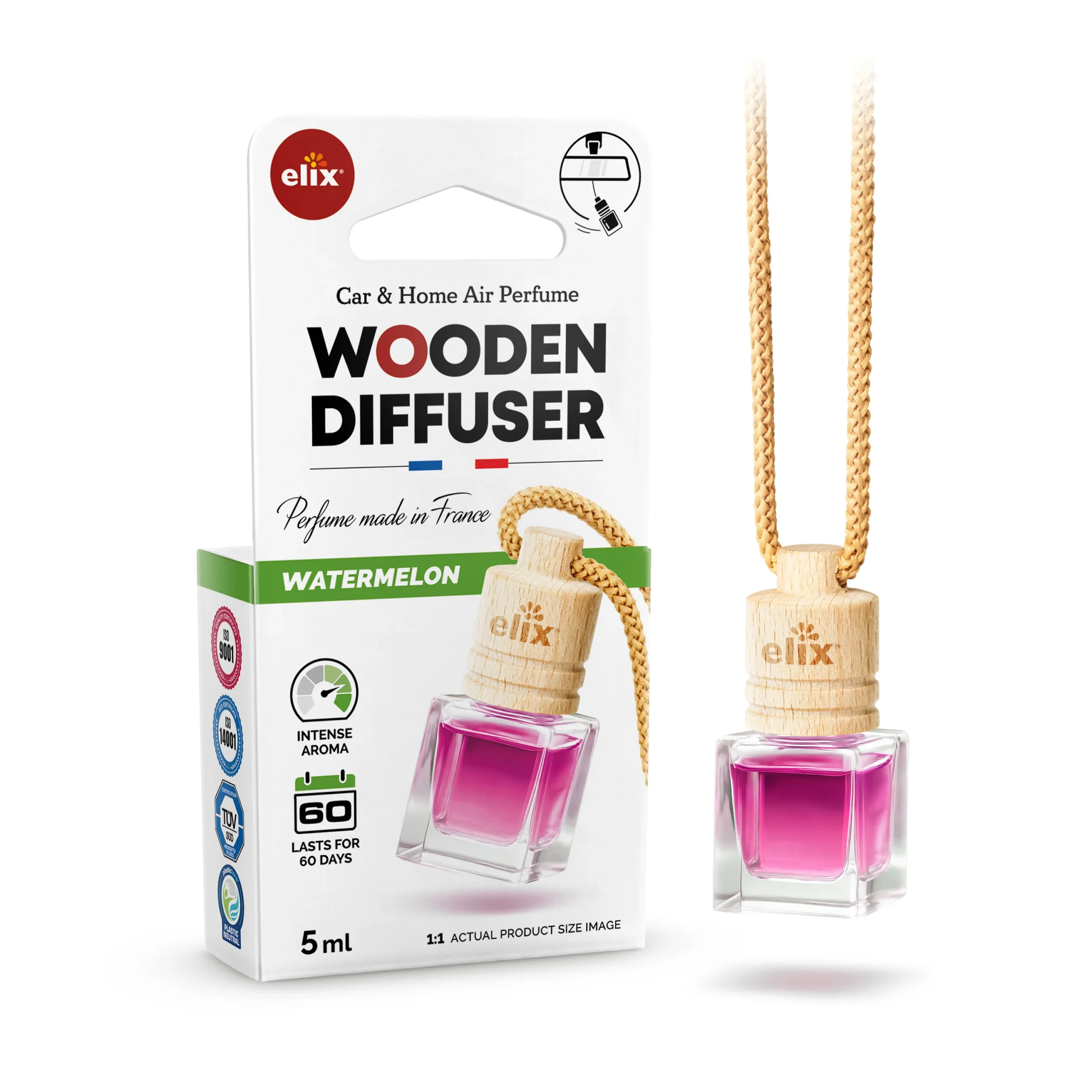 A bright, juicy watermelon scent with a clean green lift and a soft musky finish — delivered through natural wood diffusion. Now in a plastic-free, paper-only box, aligned with our ISO 14001 environmental management approach.